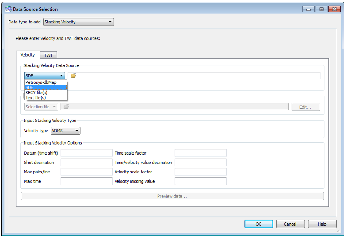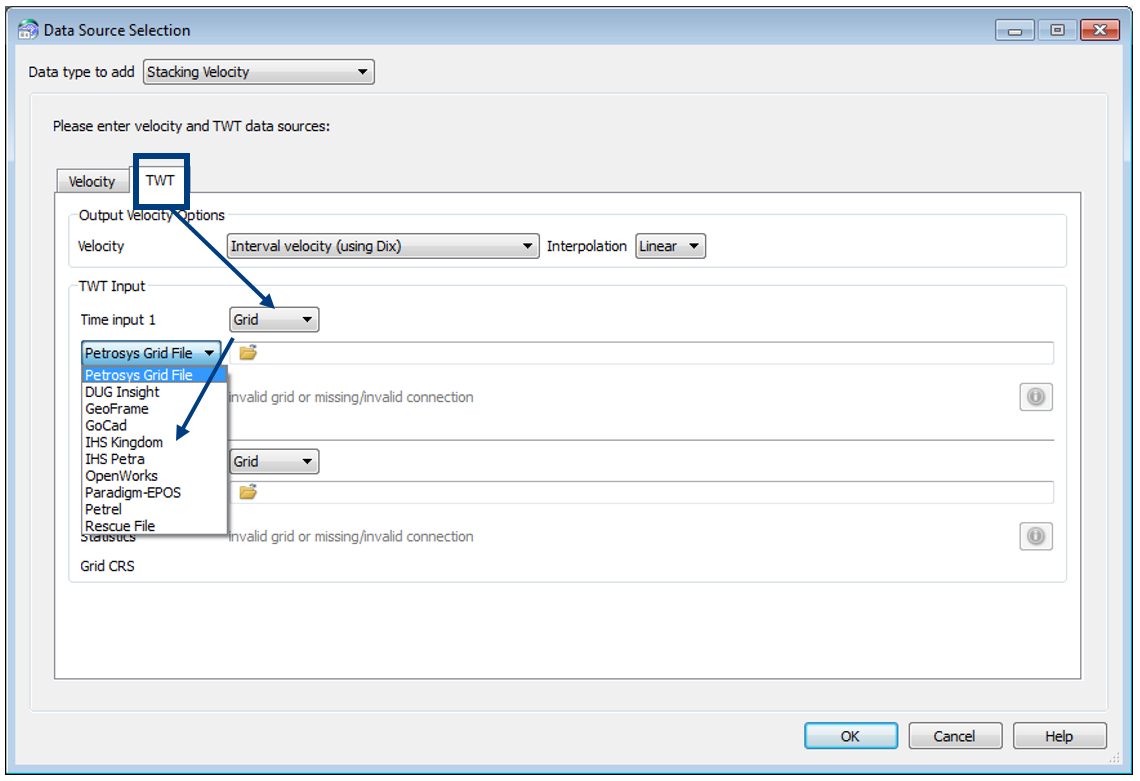 Having selected “Stacking Velocity” as the input data source, you now need to select the TWT inputs. There are two input types available: grids or a constant TWT. The grid option will allow you to select TWT grids from a number of 3rd party data sources.
