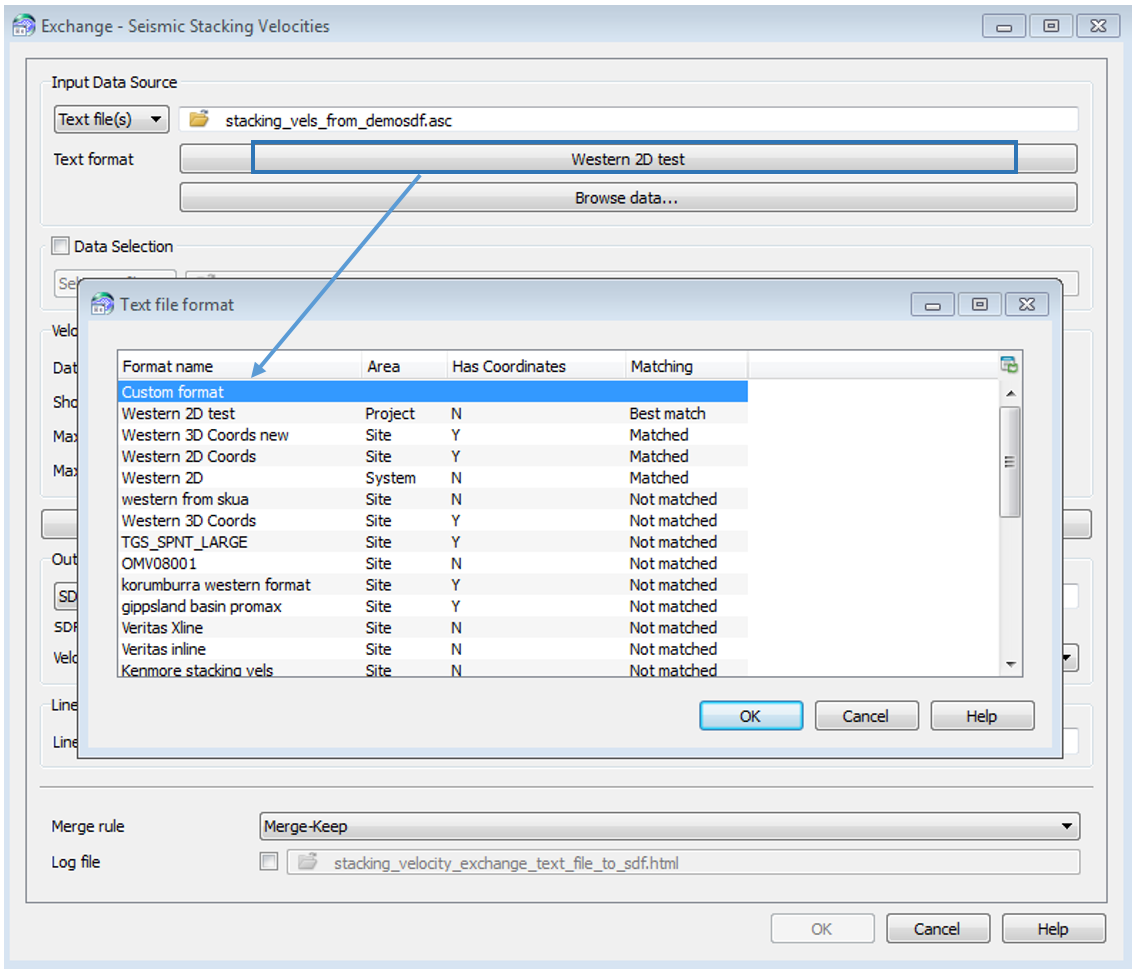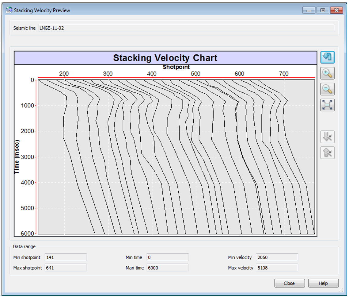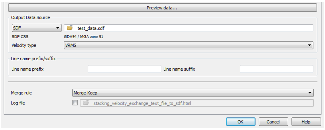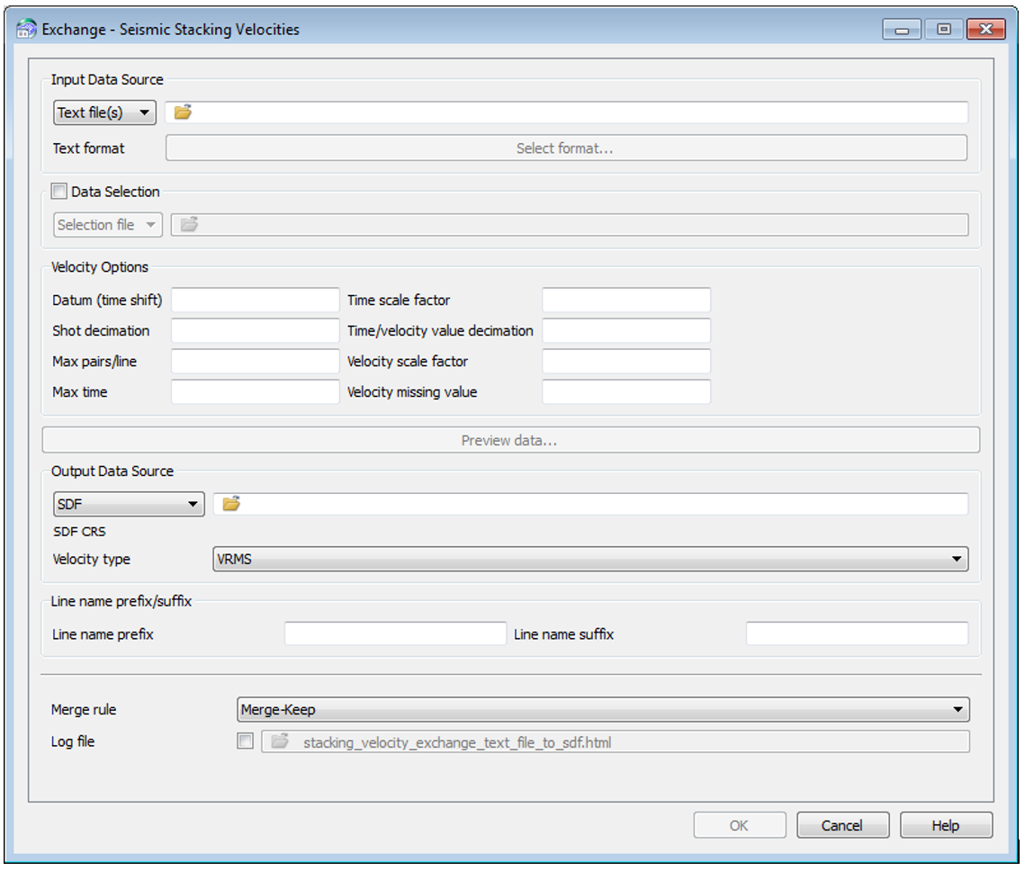 If your stacking velocity file doesn’t contain coordinates you will have to import the file to an SDF using the File > Exchange > Stacking Velocities function. This will open the stacking velocities import panel within Surface Modeling, allowing you to save, edit and repeat the process.