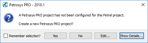 If you have not configured a Petrosys PRO project for a particualar Petrel or DecisionSpace project, a prompt similar to the one below will be displayed when launching the plugin in PRO 2018.1.