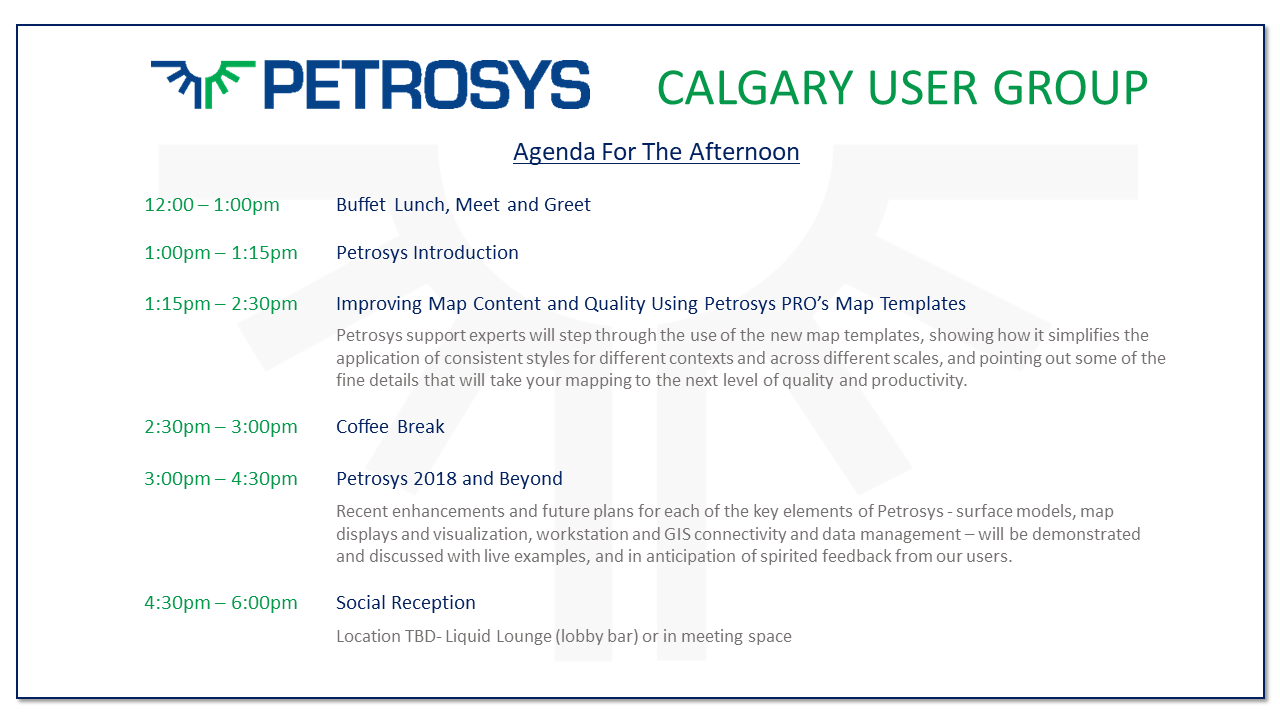 Petrosys would like to invite our Calgary users to participate in our User Group Meeting on Thursday, March 1st, 2018, where we will be running a series of short presentations and demos focusing on the new Map Templates functionality released in Petrosys PRO 2017.1.