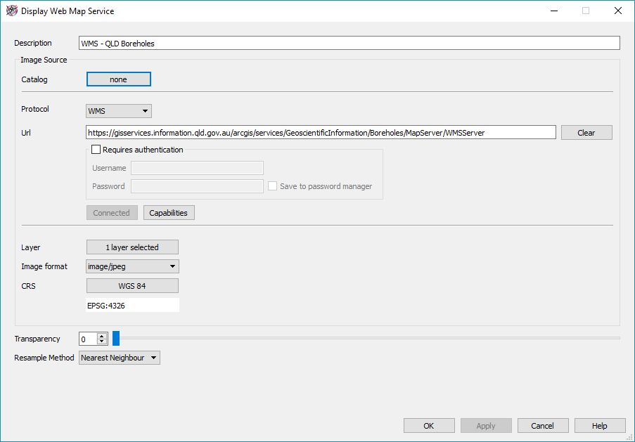 After editing the new entry, save the file and launch Petrosys. Open your map and display a web map service from Display > Web Map Service… Click on the Catalog button.