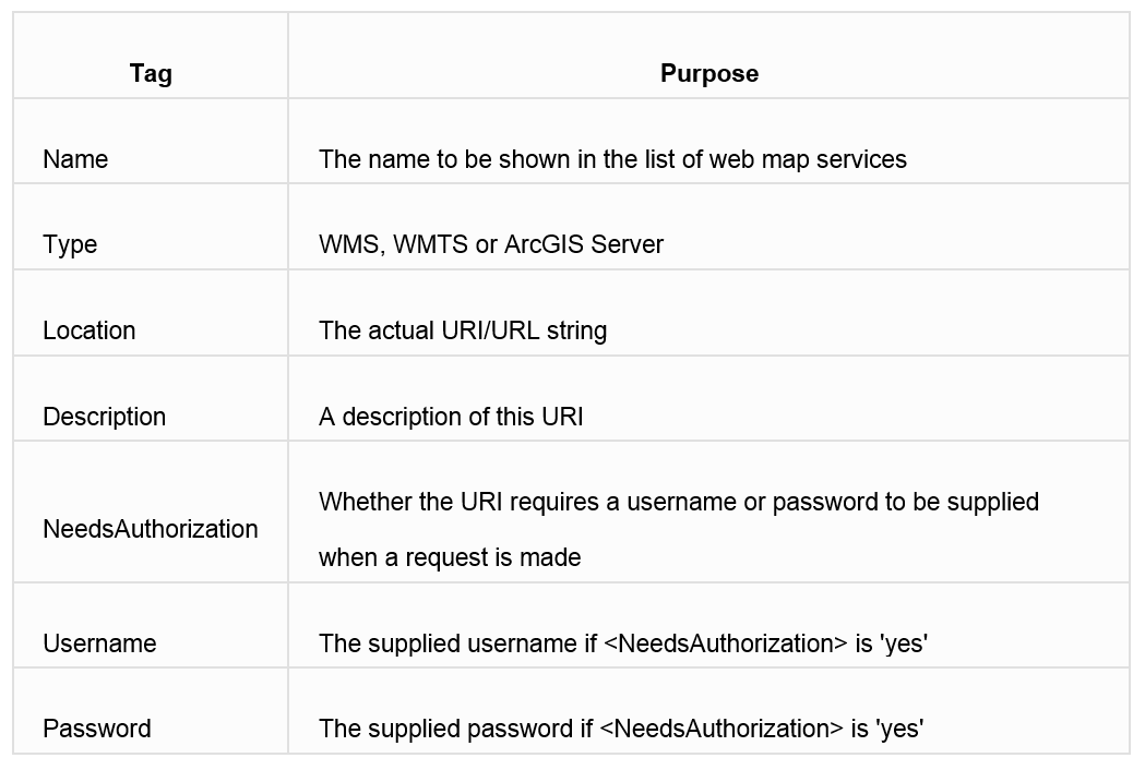 To add a new map service to the catalogue, an easy way is to copy/paste one of the existing entries and then replace details accordingly. To help you populate these parameters, see the table below from our online help.