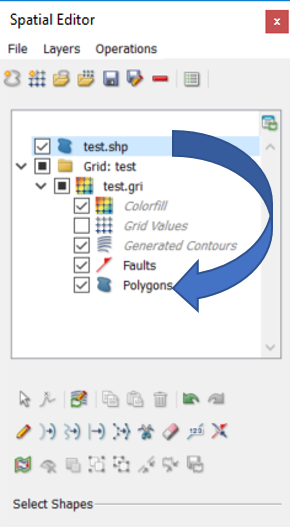 The next step will be to drag the holey polygon (shapefile layer) into the ‘Polygons’ layer of the Spatial Editor. You’ll be asked to select the overwrite mode when doing this. Depending if you have additional polygons in the grid or not, you may choose ‘merge’ or ‘replace’. Then you’ll be prompted to enter the clipping polygon details. Select to clip ‘Outside’ and leave the blanking polygon value blank.