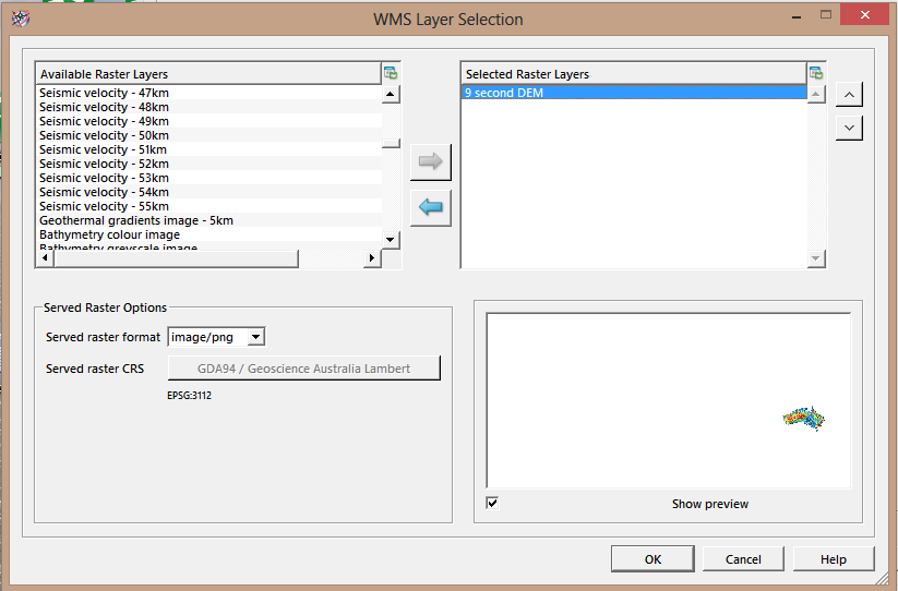 Select the layer(s) you wish displayed (the preview below shows Australia on a World map):