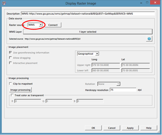 Web Mapping Services (WMS) are accessed via Mapping/Display/Picture/Raster Image…, selecting the WMS Raster source dropdown and then inserting an appropriate link from the internet (URL). A range of WMS service listings are available on the internet or a WMS server can be set up in-house with assistance from Petrosys. A Known WMS connection to OSGeo WMS Images has been provided within Petrosys but others can be easily added as required, such as the Geoscience Australia example illustrated in the following images.