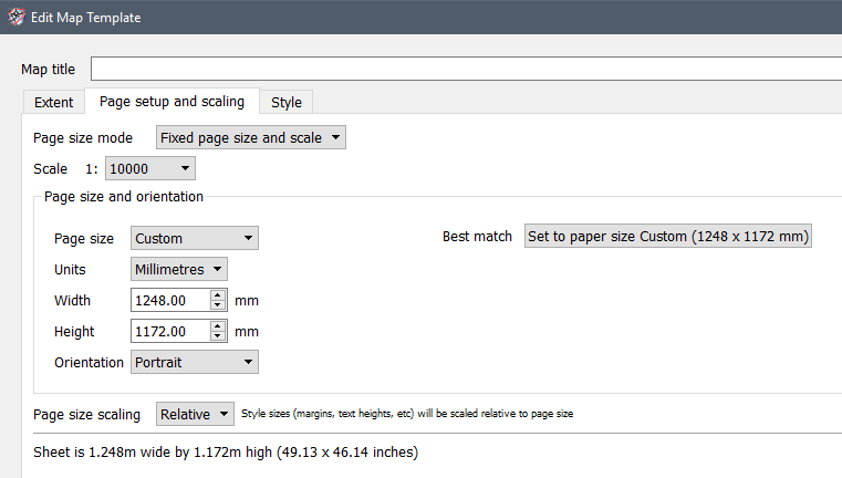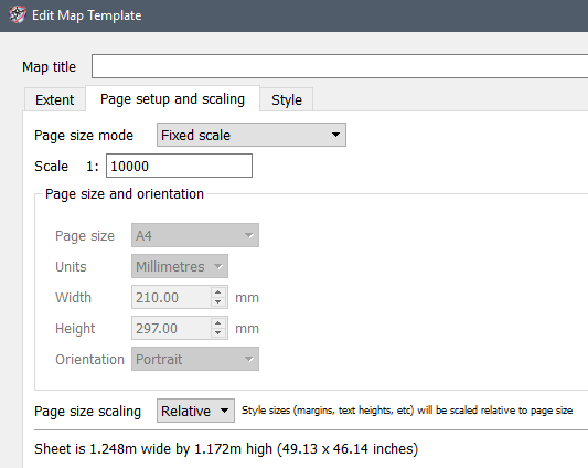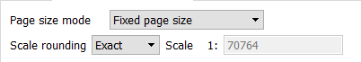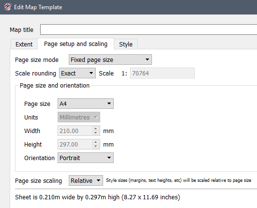 If you require a map at an exact scale, change the page size mode to ‘Fixed scale’. This mode allows you to set a desired map scale. When you select this mode, the physical print size of the map is also displayed.