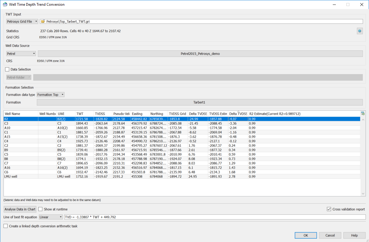 In the below example, the cross-validation report has been enabled. From that report, you can see the well ‘B2’ has a delta of ~4 metres.