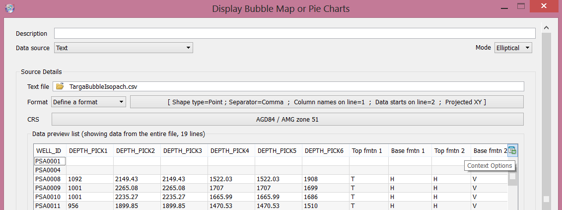 In Petrosys, bubble maps can be accessed via the Mapping module by navigating to Display > Bubble Map… There are a number of available data sources for generating bubble maps including Excel spreadsheets, text files, culture files and a number of 3rd party data sources like Geoframe, OpenWorks, dbMap, IHS Kingdom, GeoGraphix and Finder.