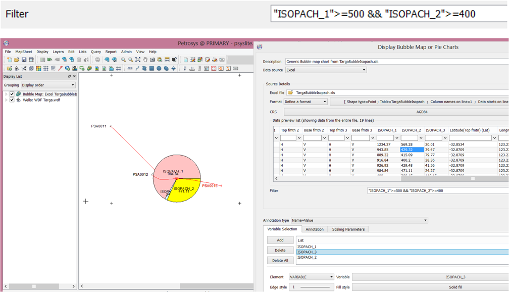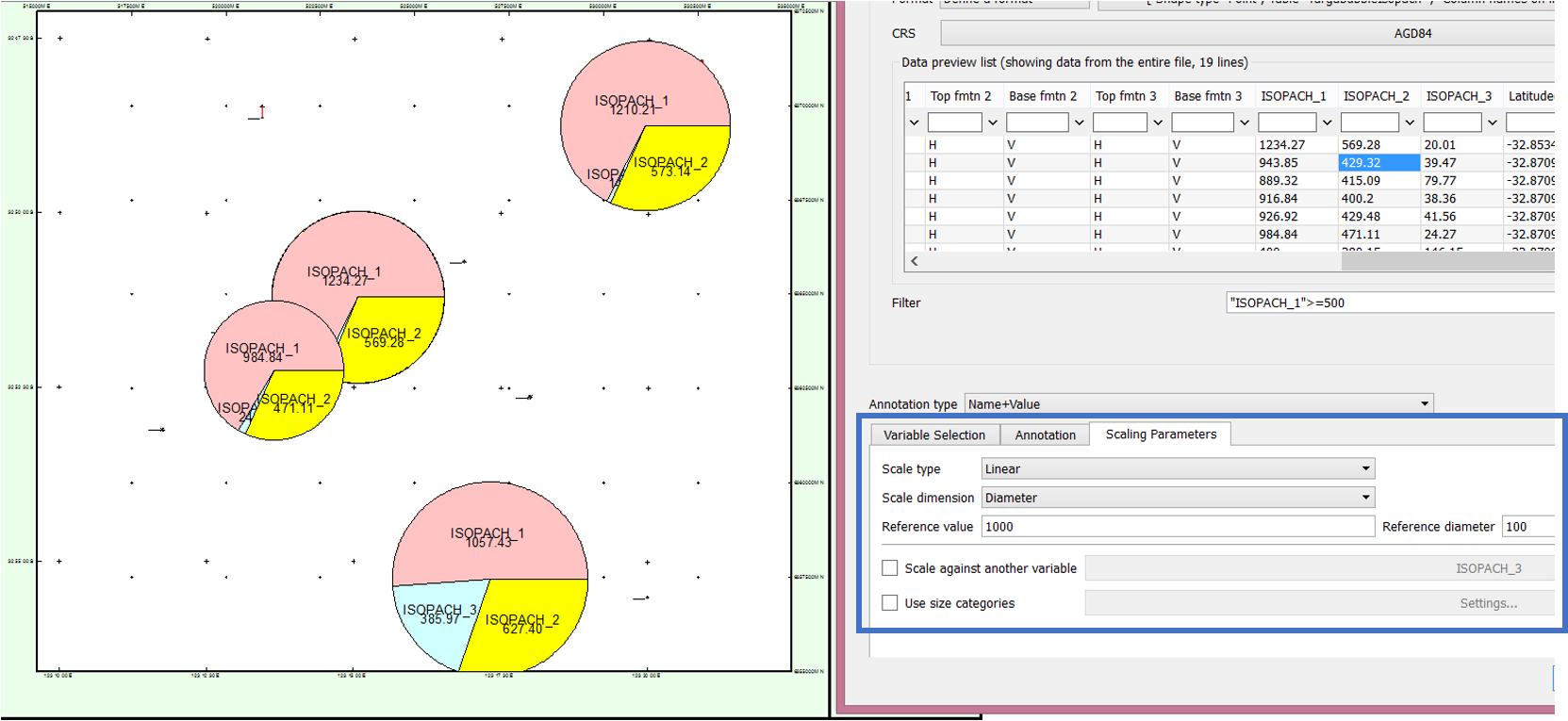 Filtering data to be displayed on the bubble map can be done in the Filter field below the Data preview list. As an example, the filter rule expression used below will only post bubble map values equal to or exceeding 500m thickness from Isopach_1 and equal to or exceeding 400m thickness from Isopach_2 variables.