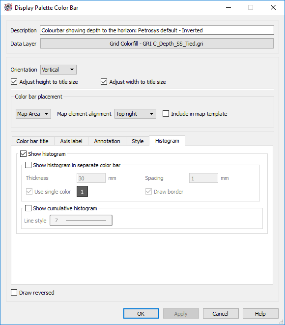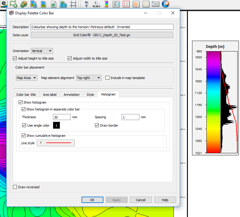 The latest release of Petrosys PRO 2018.2 introduces the ability to display data histograms associated to color bars. Once a grid or surface is displayed with its associated color bar, the option to display a data histogram can be accessed from a new tab that has been added to color bar panel.