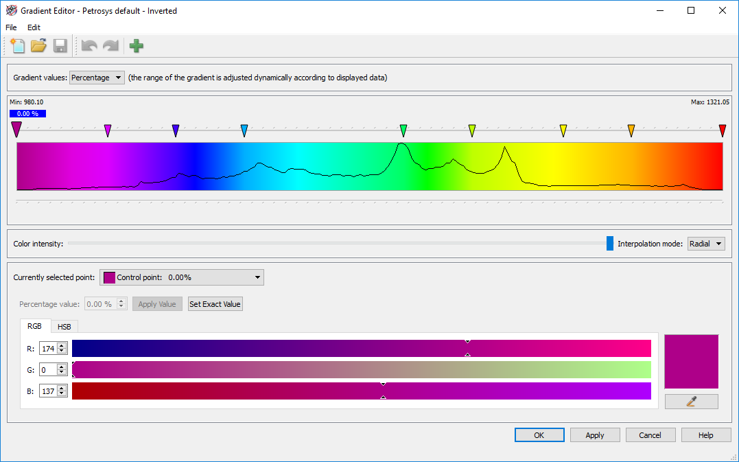 Another way to visualise the data histogram is through the Gradient Editor being applied to the relevant grid. To being able to have the data distribution in this panel can be useful when setting control points for a gradient to highlight features in a grid or surface.