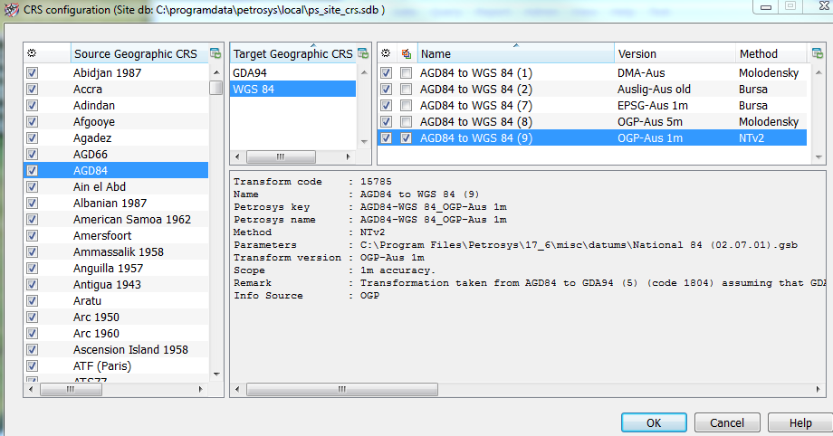 Petrosys software handles these transforms correctly using the latest EPSG transforms available (check their website www.epsg.org for details). In the Australian example above, we transform data to a WGS84 datum, then to GDA94 (or previous AGD datums) using the correct parameters as supplied by EPSG.
