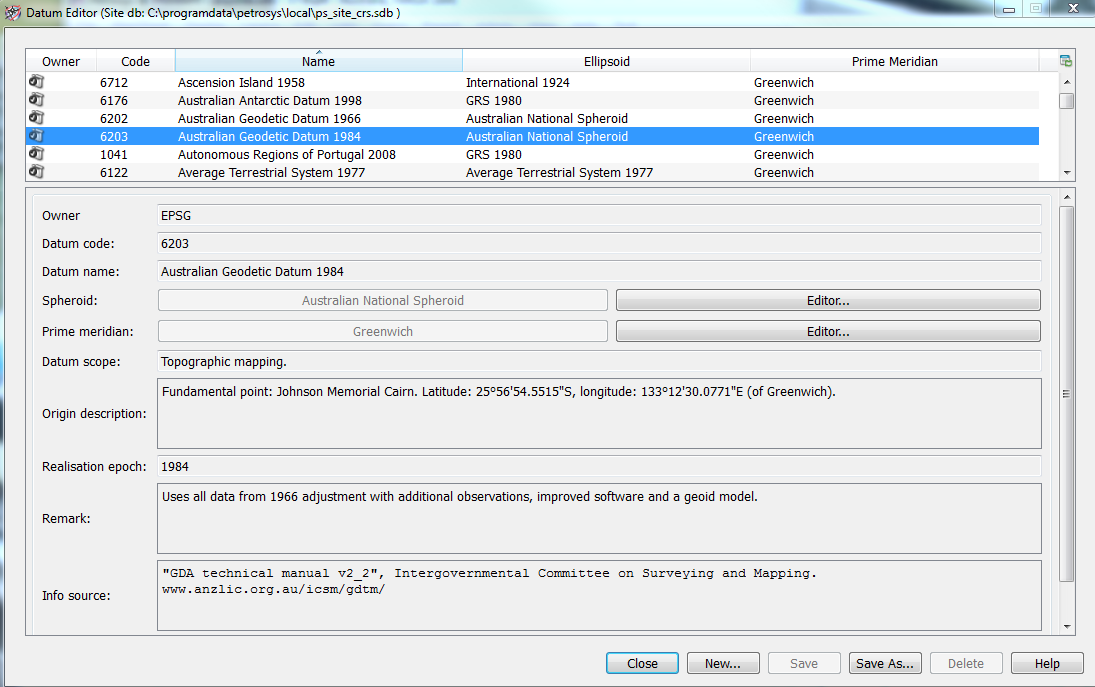 Petrosys’ datum editor screen showing the AGD84 datum and its associated parameters for spheroid (ANS) and prime meridian – data is based on the EPSG database.