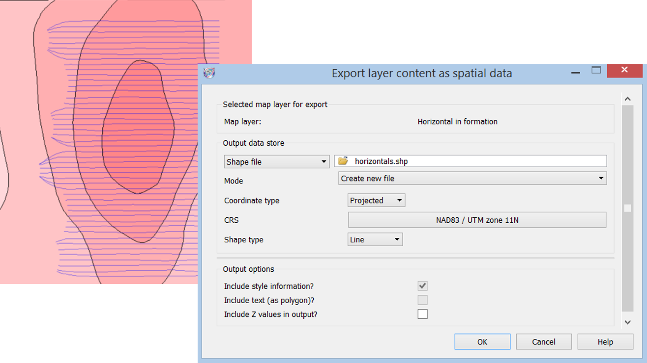 - In the Export spatial layer window, select Output data store to be Shape file and give it a name. Change Shape type to be Line, then use Display > GIS… to display the shape file created on the map.
