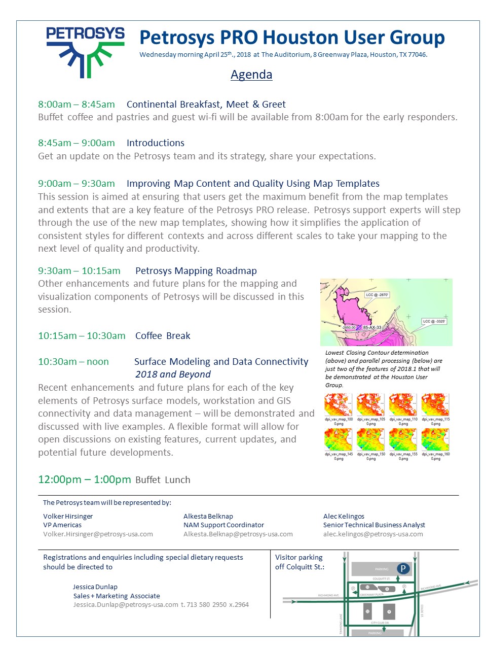 Petrosys would like to invite our Houston users to participate in our User Group Meeting on Wednesday, April 25th 2018, where we will be running a series of short presentations and demonstrations focusing on the new Map Templates functionality released in Petrosys PRO 2017.1.