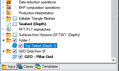 Back in the Petrel project, if you were dealing with fault data, as in this example, you will now have two new folders in your Input pane: one with the grid data that was overwritten and another for the edited fault polygons. These datasets now contain the edits that you did in Petrosys that were pushed back into the Petrel project as soon as you saved them in the Spatial Editor.