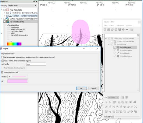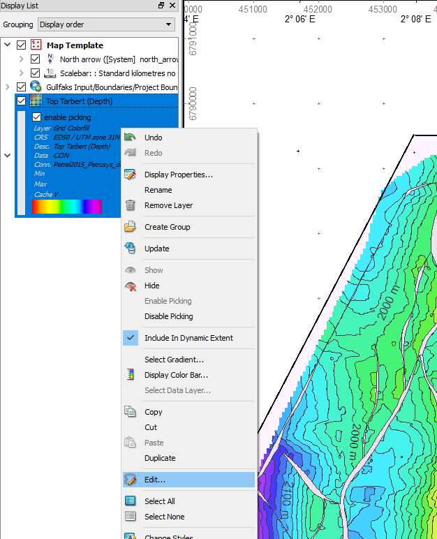 Now you are displaying the grid in Petrosys directly from your Petrel project. To start editing, select the grid in the Display List or in the mapping area, right-click it and select Edit… Alternatively, open the Spatial Editor from the Edit menu and then drag the grid from the Display List into the Editor.
