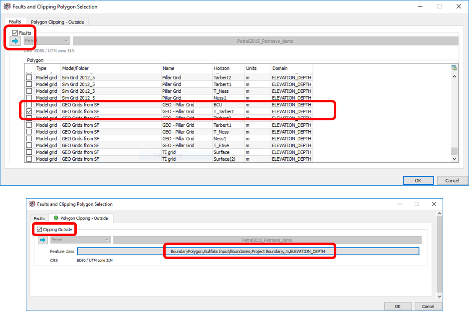 You will now be prompted to select faults and clipping polygons from your Petrel project. Note, as in any other panel when you need to select Petrel data, there are multiple ways of doing this: 1) by selecting directly from the list, 2) by ‘drag&drop’ from Petrel into the relevant box, and 3) by selecting the data in the Petrel Input panel and then clicking in the relevant ‘blue arrow’.