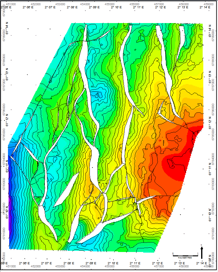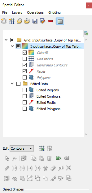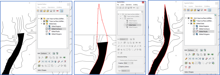 Now proceed to edit the grid either in ‘Grid’ or ‘Contours’ mode. Below shows ‘Contours’ mode to improve the definition of a fault polygon using one of the many editing tools available in the Spatial Editor.