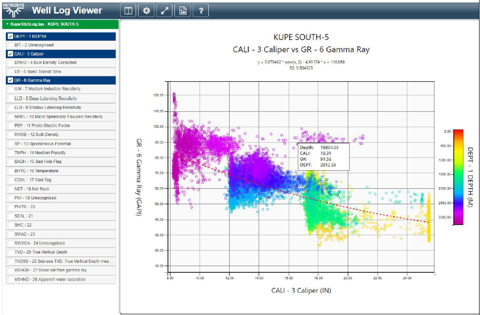 A new display mode has been added to the Well Log Viewer to show the well log data in a cross plot. The cross-plot mode supports customisable axes and line of best fit calculations.