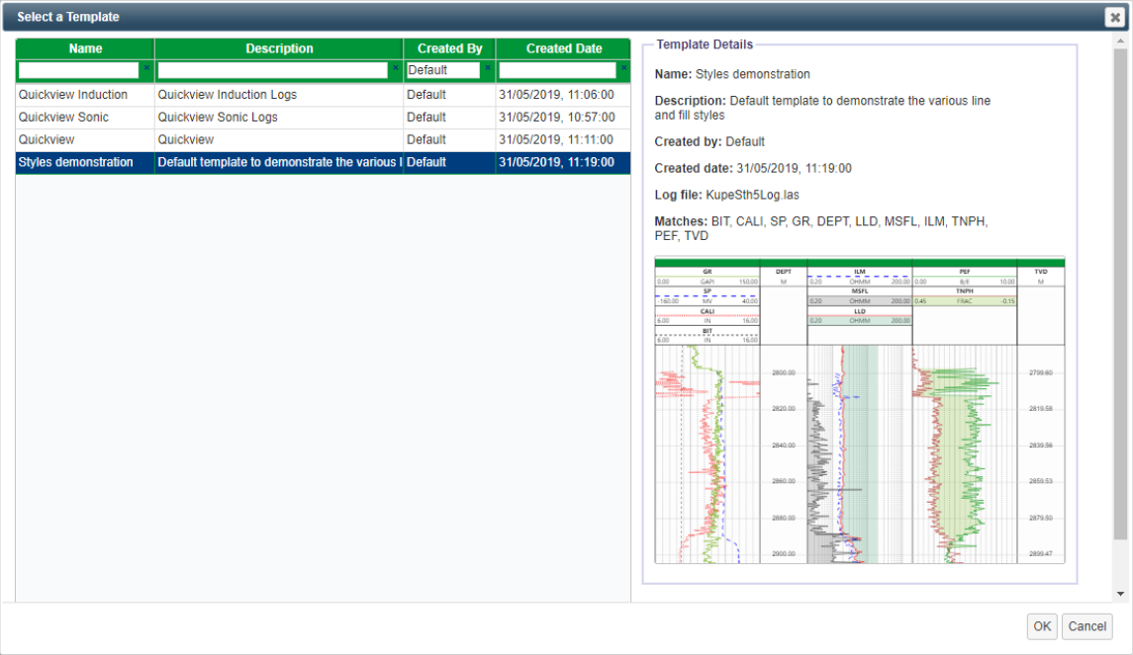 2019.2 has user-defined well log templates incorporating track and curve layouts and styles. Templates can be applied to any well log, providing a quick-and-easy method of displaying log curves with a consistent layout and style, allowing users to quickly switch between different views of their log data.