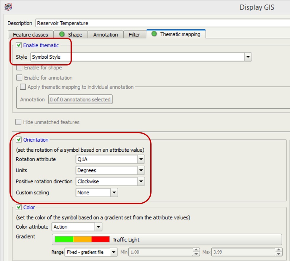 - The next stage is to display the data using the Display GIS option. Our custom well symbol (the filled quarter circle) is selected for the Point style in the Shape tab. In the Thematic mapping tab choose the new Style option called Symbol Style. Orientation is switched on and we use the column “Q1A” to set the rotation.