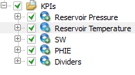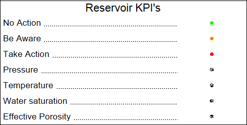 One interesting use of this functionality is to display a traffic light system – green “no action”; amber “caution”; red “take action” – for key performance indicators. In the example below, 4 KPIs for the producing sand are measured and posted on the map at the sand top location.