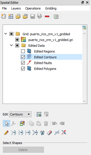 The new grid editor answers these user suggestions. The logic is that a grid can be split into constituent parts; namely grid nodes, contours, faults and clipping polygons. When a user creates or edits any of these items, the new Grid editor will re-generate the grid to reflect these changes (ie. keeping the grid’s constituent parts in sync). For example, in figure 1 the user has highlighted Contours from the editable data types. Users can now modify contours to fit their conceptual geological model and re-generate the grid – all within the same tool.