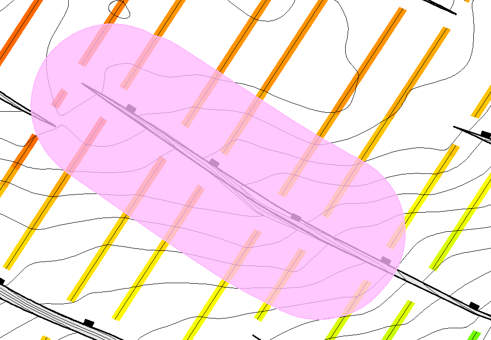 Figure 3: The kink in the fault polygon from Figure 2 has been smoothed. When selecting the localised regridding option, the grid edits will be restricted to the area within the pink polygon.