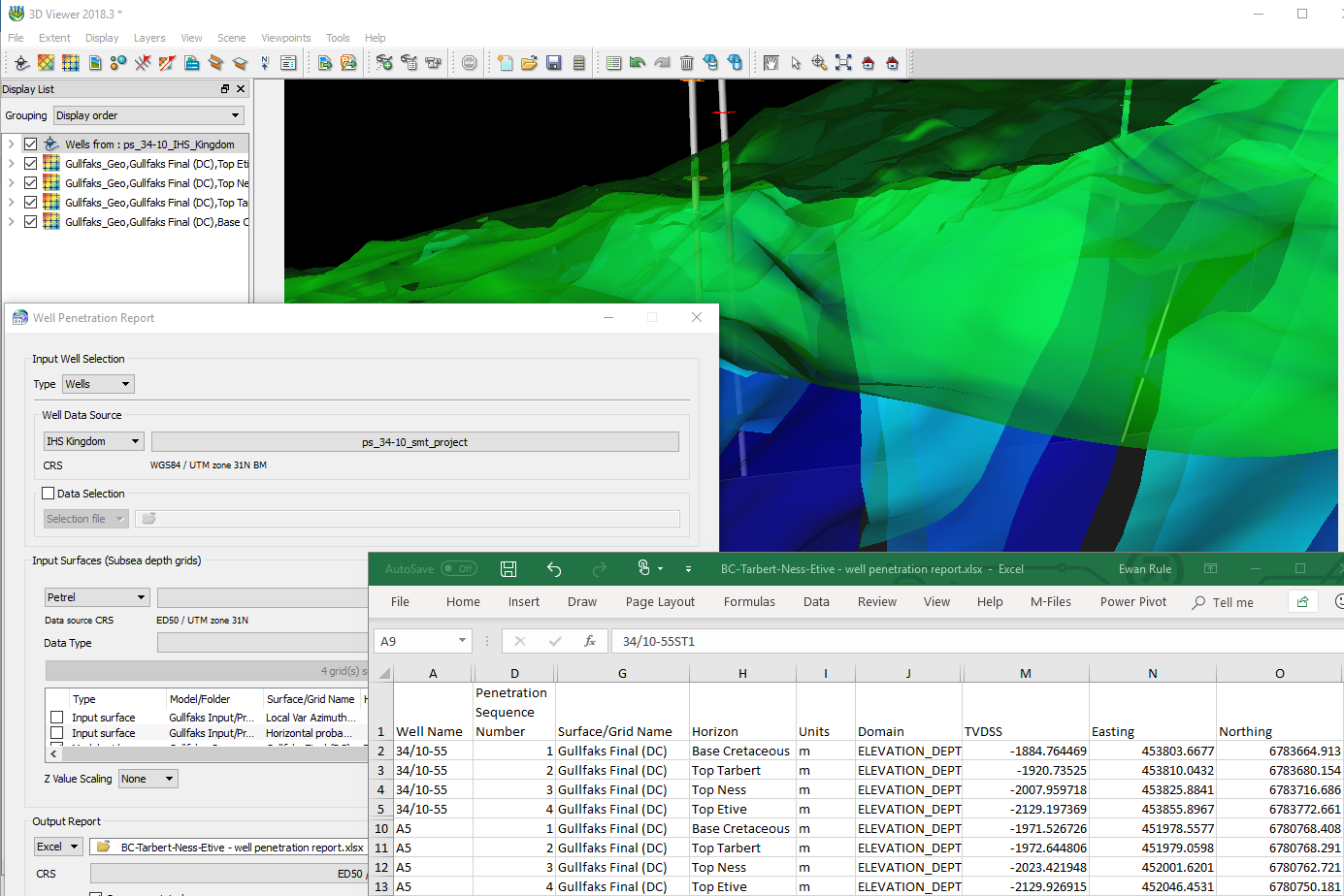 Accurately calculating the XYZ location where a borehole/arbitrary point intersects a surface is very useful for reservoir appraisal and development. The new well penetration report option will: