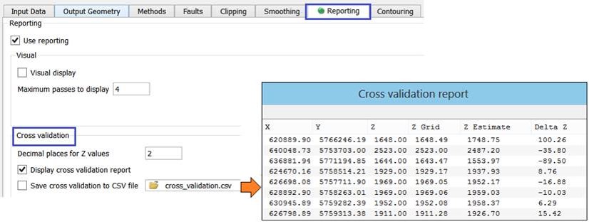 Cross validation can be activated from within Surface Modeling, Grid/Create grid, on the Reporting tab. The ‘Delta Z’ values from the output report can also be gridded to give a spatial representation of predictive error.