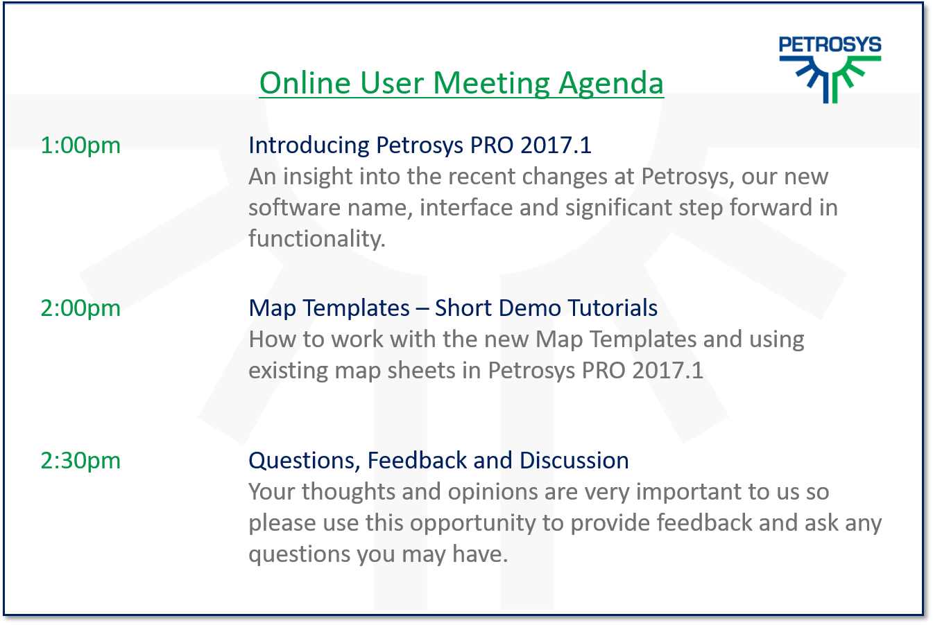 Petrosys would like to invite our users at currently maintained sites to participate in our online User Group Meeting on Thursday the 18th January, where we will be running a series of short presentations and demos focusing on the new Map Templates functionality released in Petrosys PRO 2017.1.