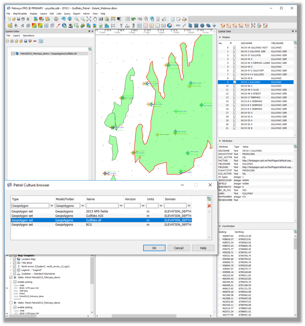 An additional enhancement includes the added support for Petrel Geogpolygons, which are used for closed polygons with holes and attributes suitable for cultural data and risk evaluation maps. These geopolgyons can now be dsiplayed in Mapping. Furthermore, these features can be edited within the Spatial Editor and once you save any edits, these will be pushed back into the Petrel project automatically.
