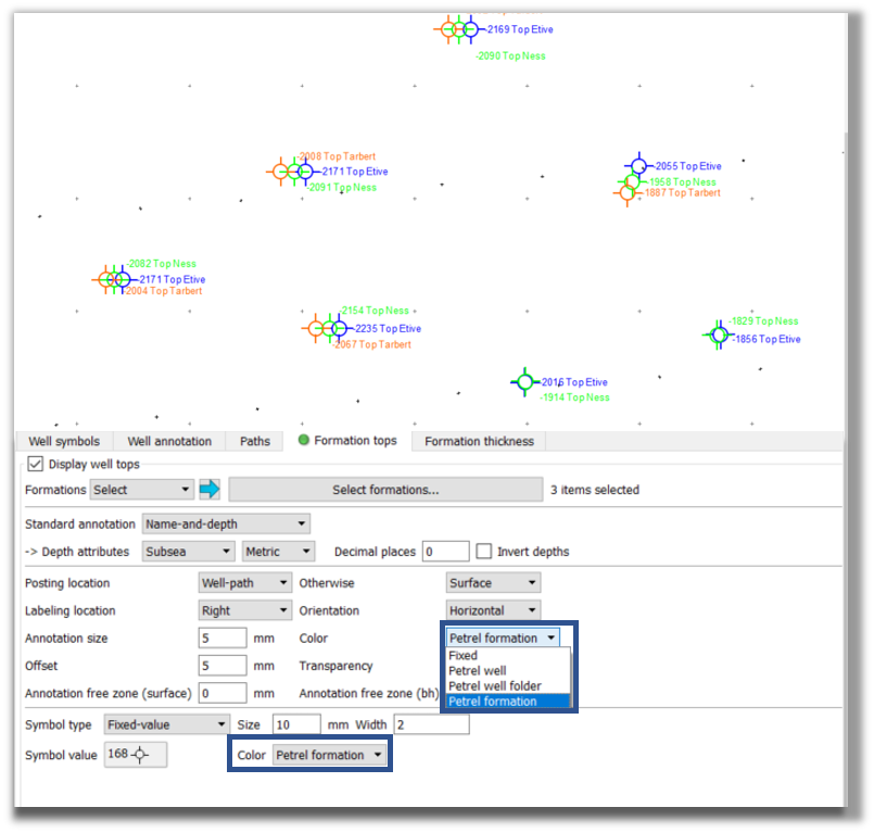 Petrel also allow users to set specific colours for each formation top. These formation colours can also be maintained on a Petrosys PRO map.