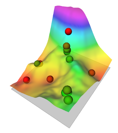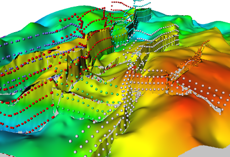 Point data can be displayed directly from text or Excel files, shapefiles, Petrosys culture files and Petrosys sampled data (GIP) files, and is represented within a 3D visualization as either a sphere or a cube, which will be centred on the coordinates provided by the chosen data source. The size and color of each point may either be specified manually, or set using attribute values from the data source, allowing physical attributes to be effectively modeled in three dimensions.