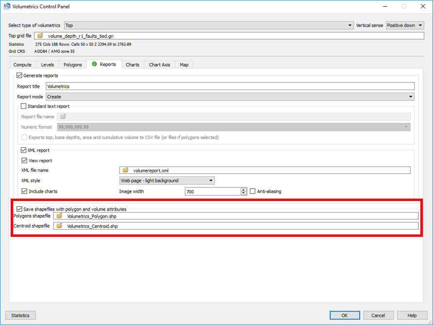 The option is available by specifying polygon and centroid shapefile names in the ‘Reports’ tab of the volumetrics task.