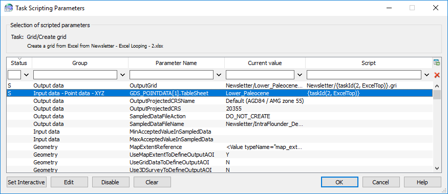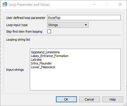 Note: Set the Loop input type to ‘Strings’ in the accompanying looping task (Graphic 3). The Input strings to entered are taken from the names of the sheets, as seen in Graphic 1. Once the task is run, it will loop over the different sheets and will grid the data accordingly for each formation top.