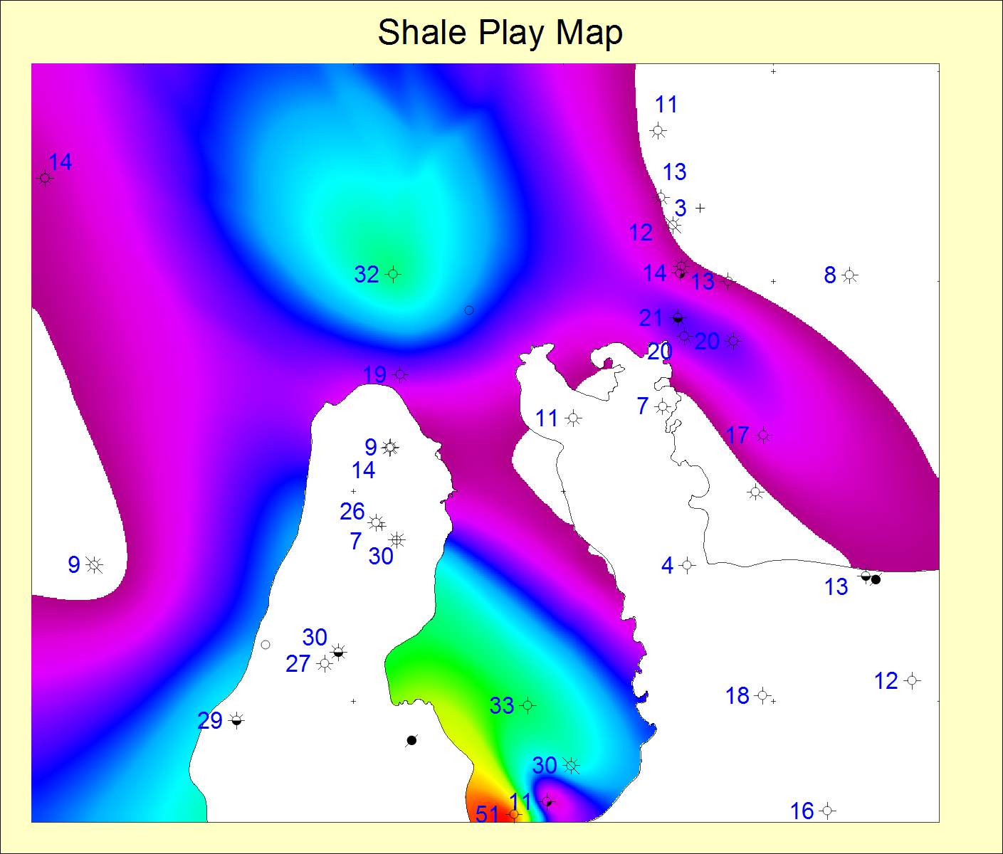 This Shale Play Map was derived by modeling the shale thickness. Prospective areas were highlighted by clipping out areas where the thickness is less than the prospective cut off (in this case 12.5m was used). The grid was also clipped where the depth was shallower than the maturity required for gas generation leaving only the prospective play area highlighted. More prospective areas are highlighted in hotter colours while less prospective areas are in cooler colours. Areas of non prospectivity are white.