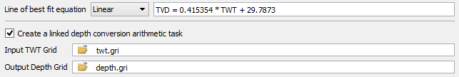 A new option available in the Surface Modeling application automatically creates grid arithmetic tasks for depth conversion based on a formula derived from the depth/velocity relationship. The formula is generated from checkshot, formations/zones of selected wells.